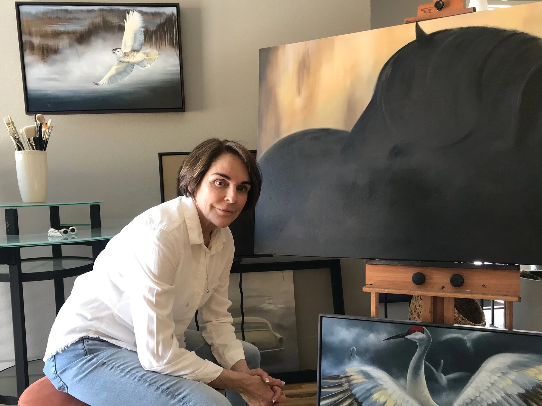 Thia Martin in her painting studio, working on an oil painting of flamingos and a sunset.